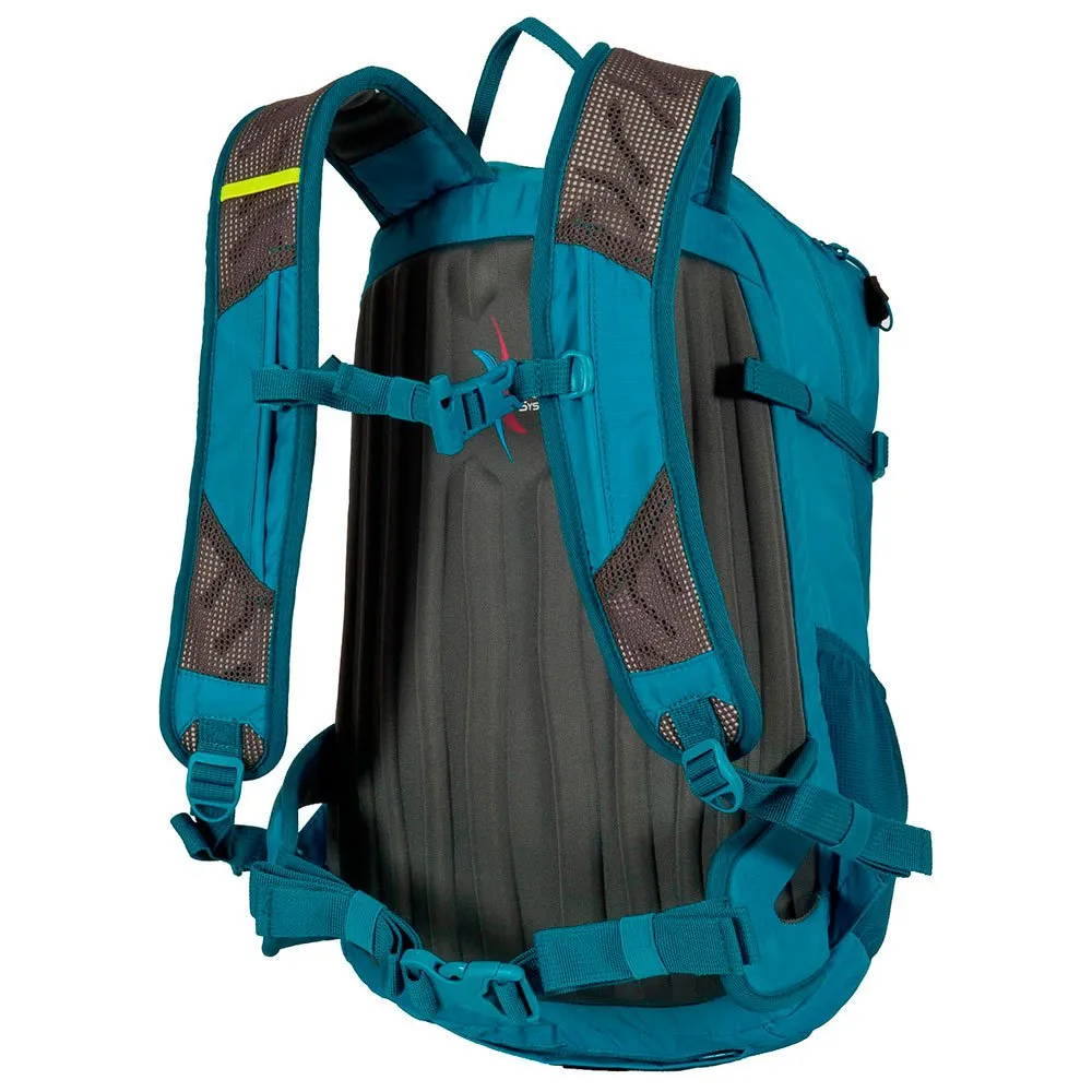 Espalda moldeada Air Breathing System,Hombreras conformadas con rejilla de ventilación,Apertura principal con cremallera circular,Bolsillo superior frontal con cremallera horizontal,Bolsillo frontal con cremallera vertical,Bolsillo frontal con volumen circular,Bolsillos laterales en rejilla con ajuste banda elástica,Correa ajuste pectoral,Elástico porta bastones,Correas compresoras laterales,Motivo porta lampara,Graficas decorativas,Cubre mochilas.